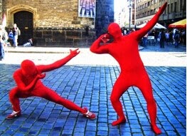 here i want to encourage people go out and have fun. we should take out a little bit more time to enjoy with friends and family members. so zentai wearers, are you ready to go out in zentai with your friends and family members? these two red men, they are really amazing in their red zentai suits.